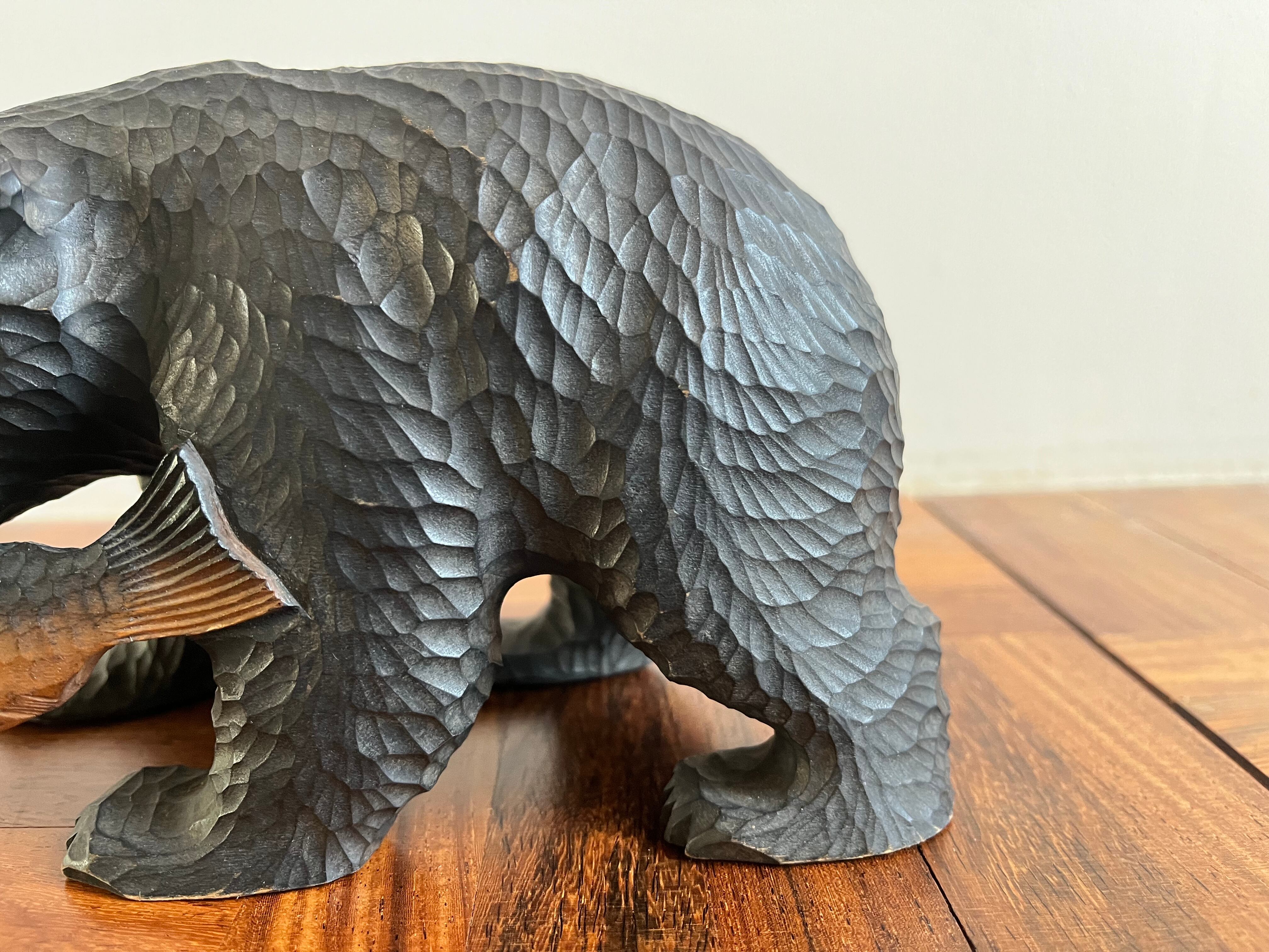 グラデーションがかった鮭を咥えた木彫りの熊。