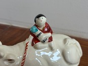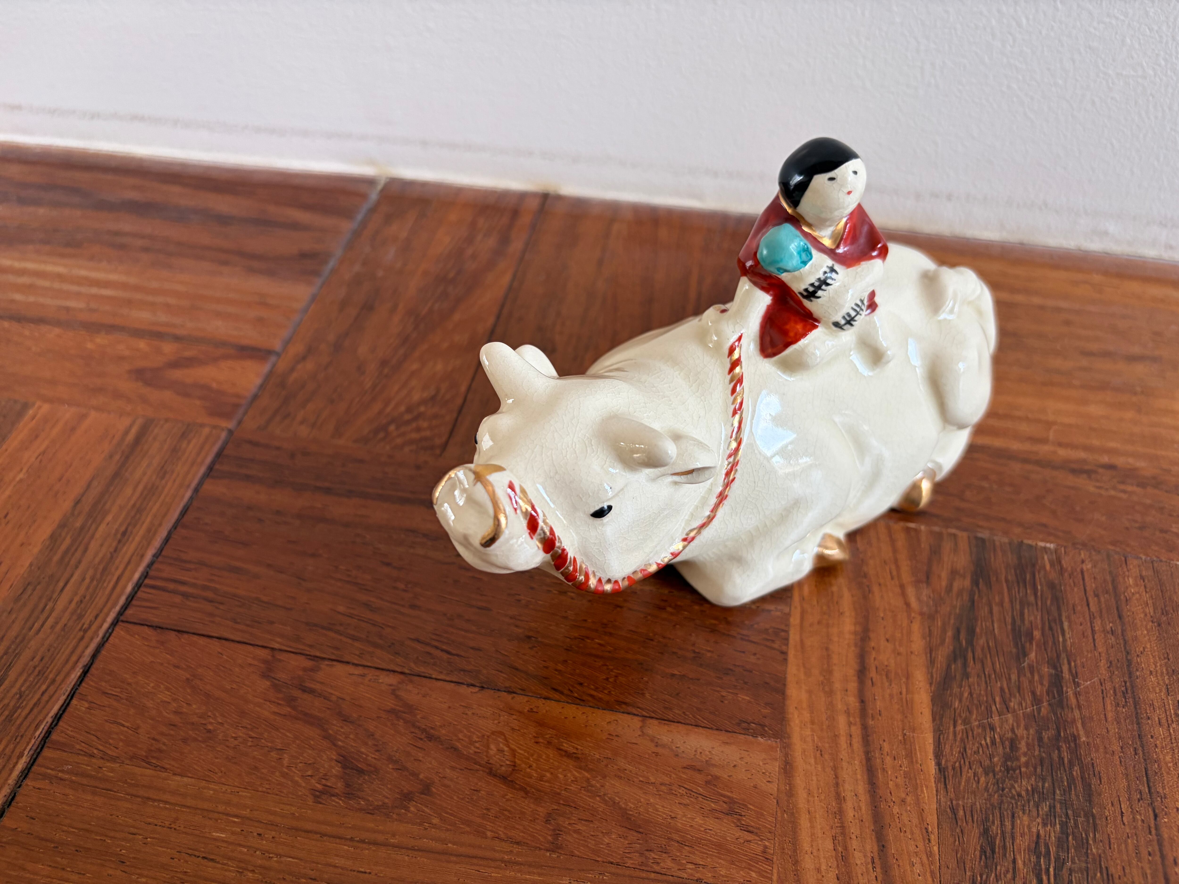 幼い子どもを乗せた牛のオブジェ。