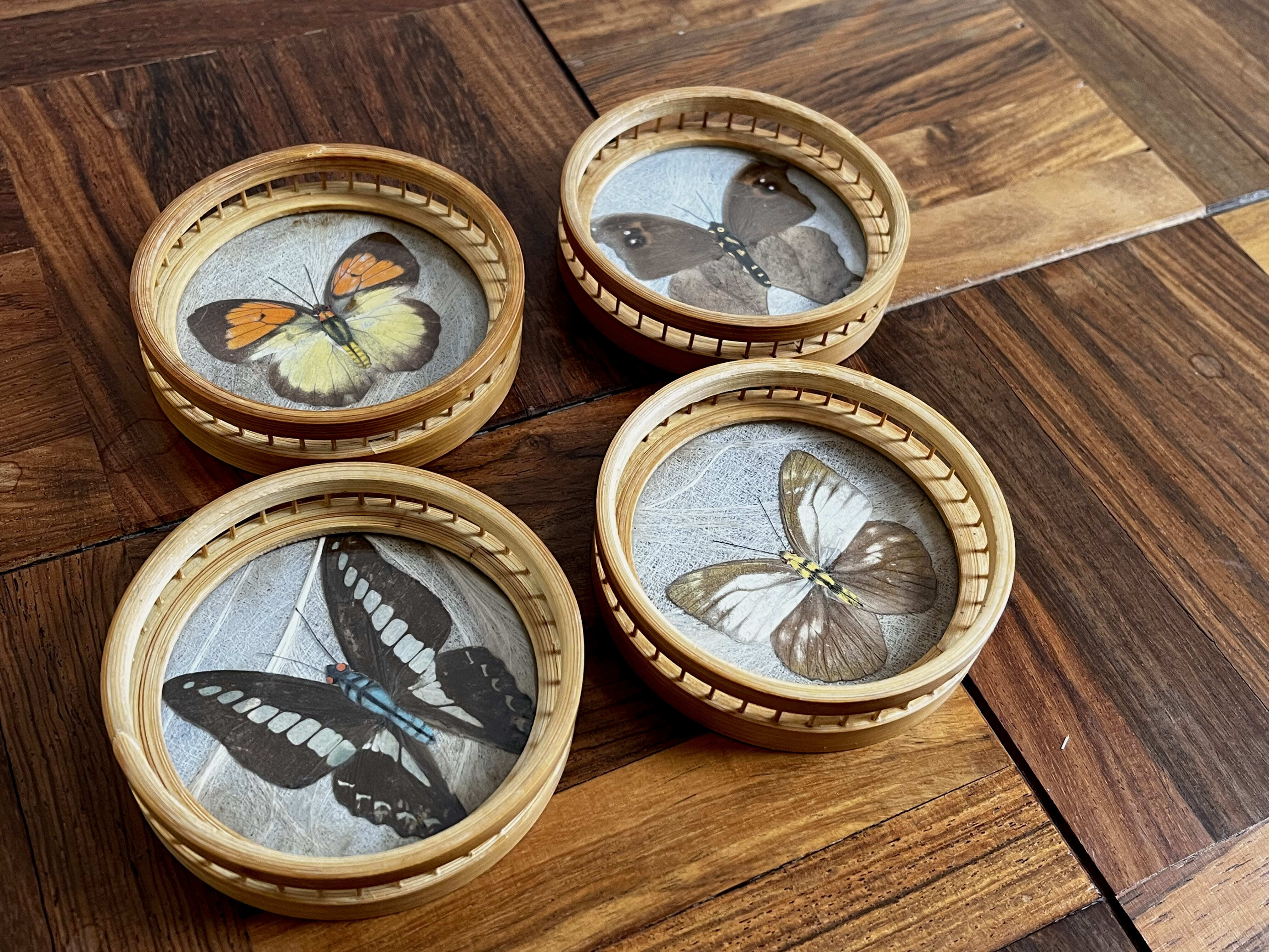 それぞれに違う種類の蝶が施された竹製のコースター。