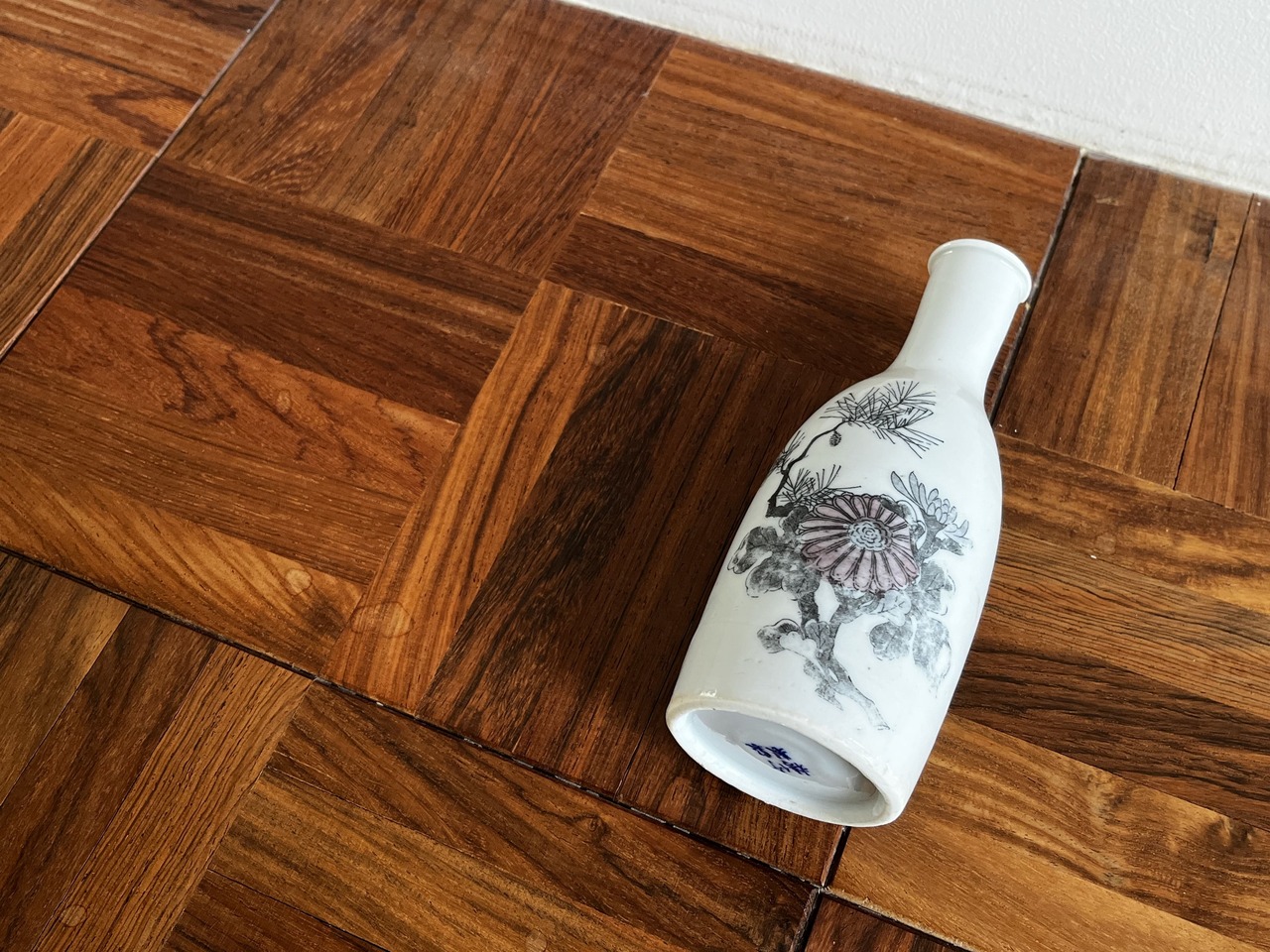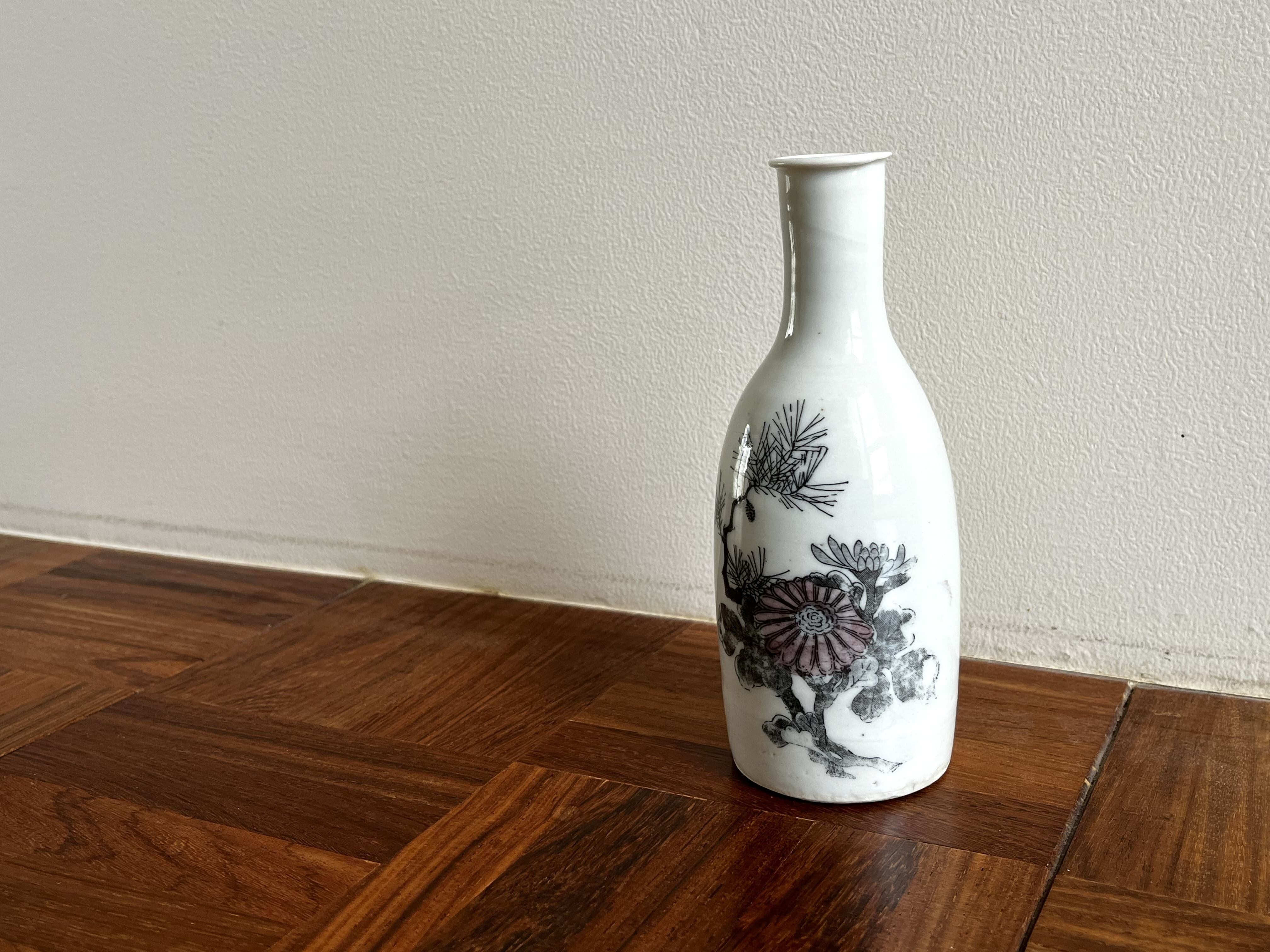 墨黒のような少し柔らかな色の線で描かれており、淡いピンクの菊の花がワンポイントになっています。