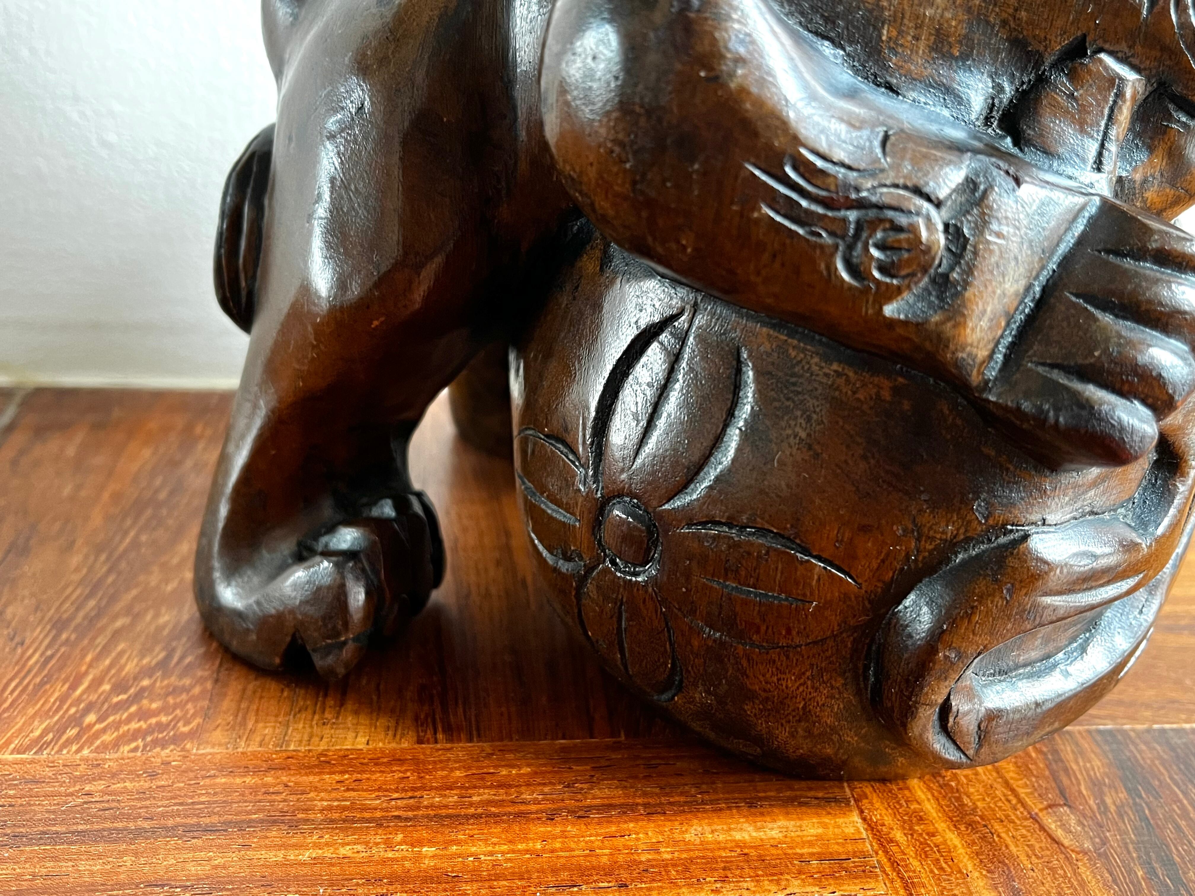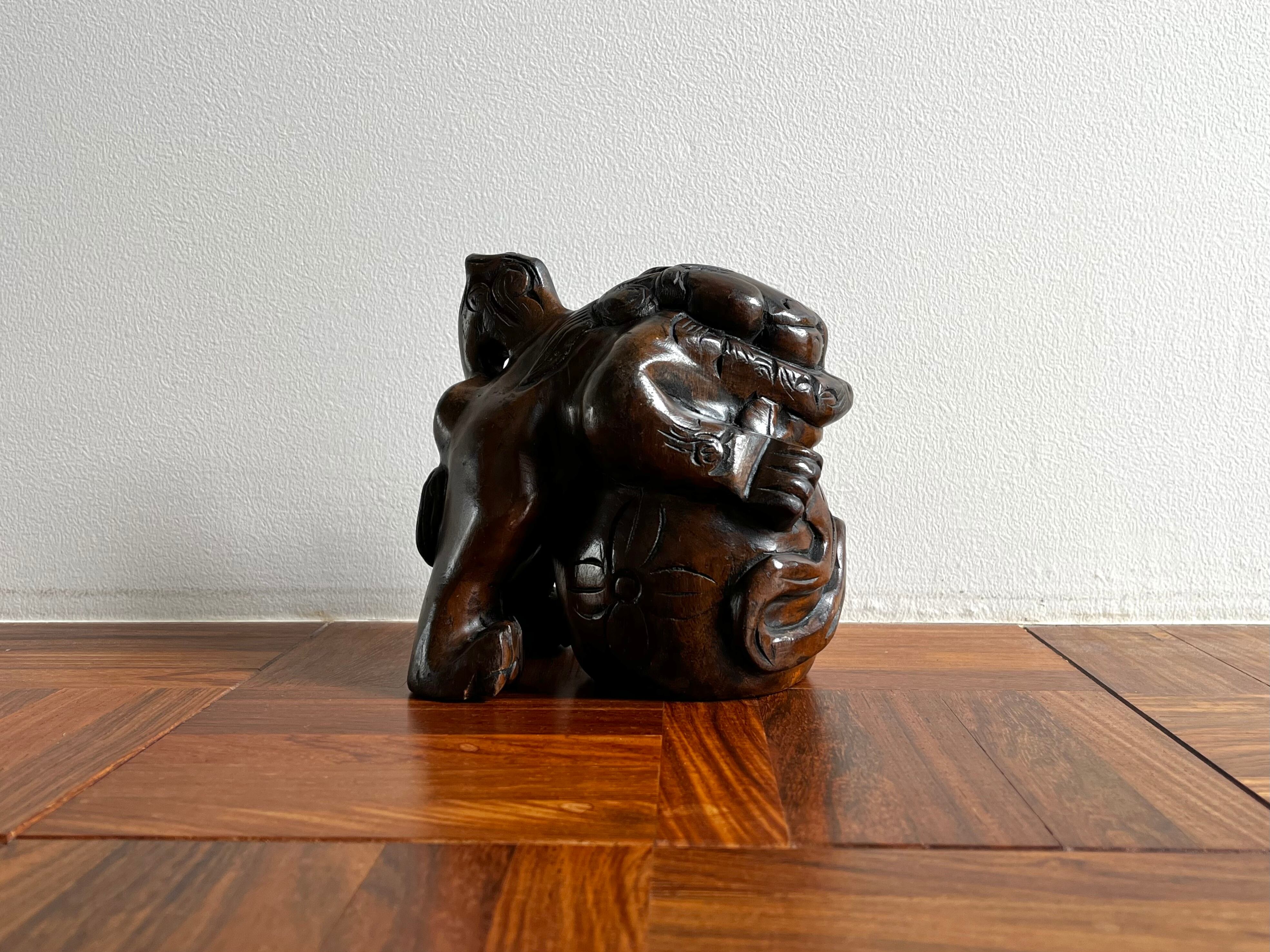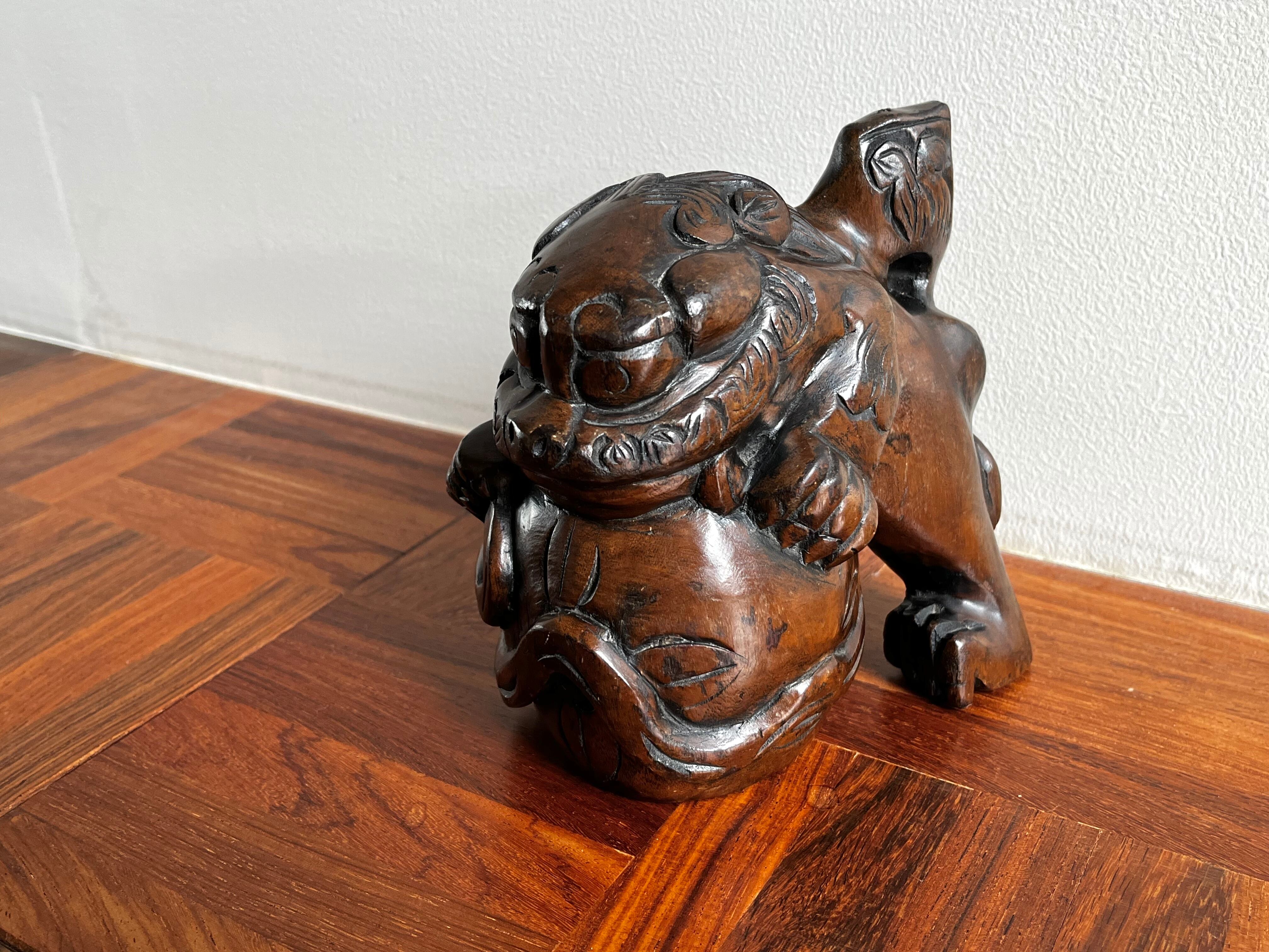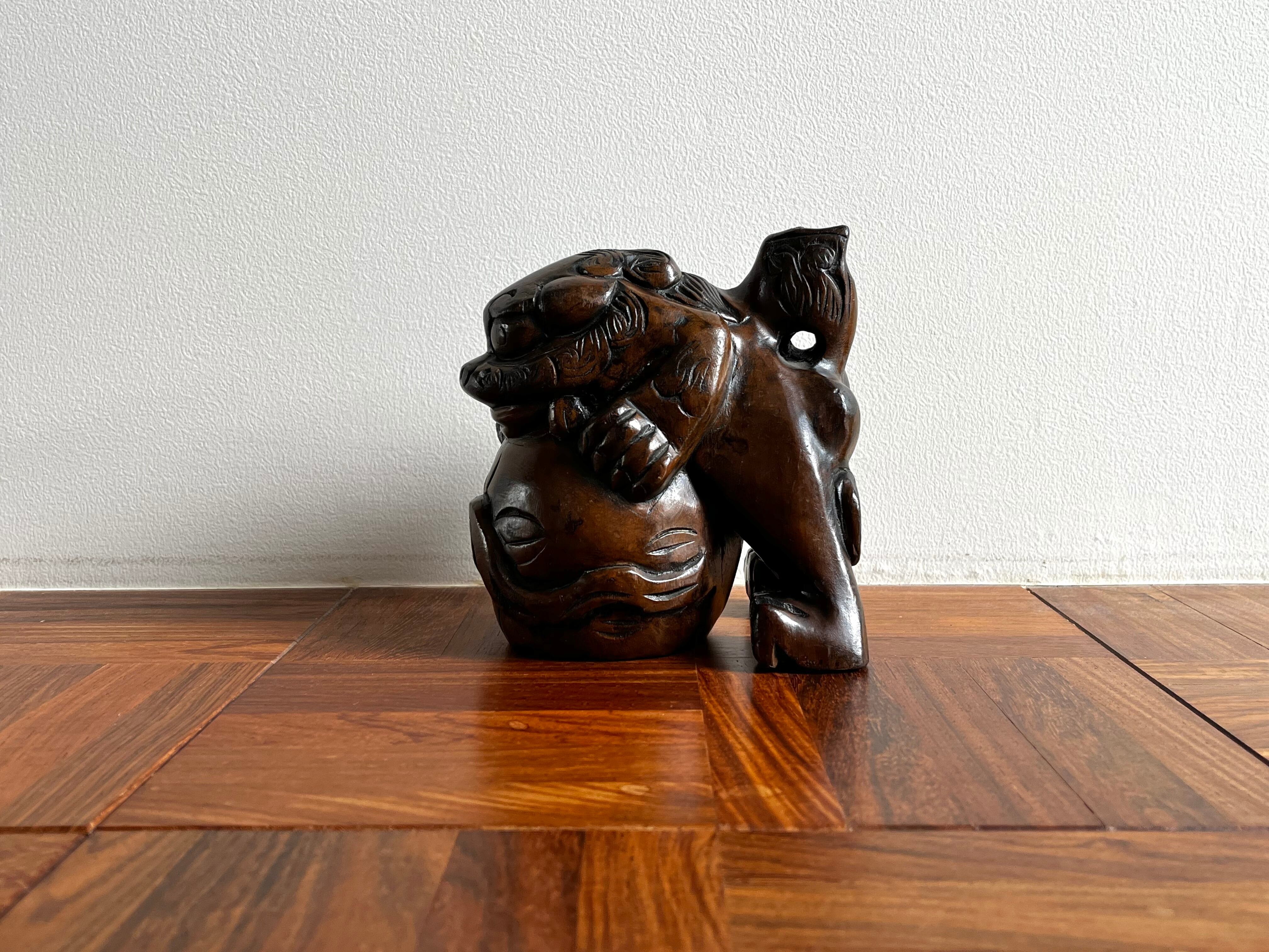 縁起の良い吉祥モチーフである木彫りの玉獅子。