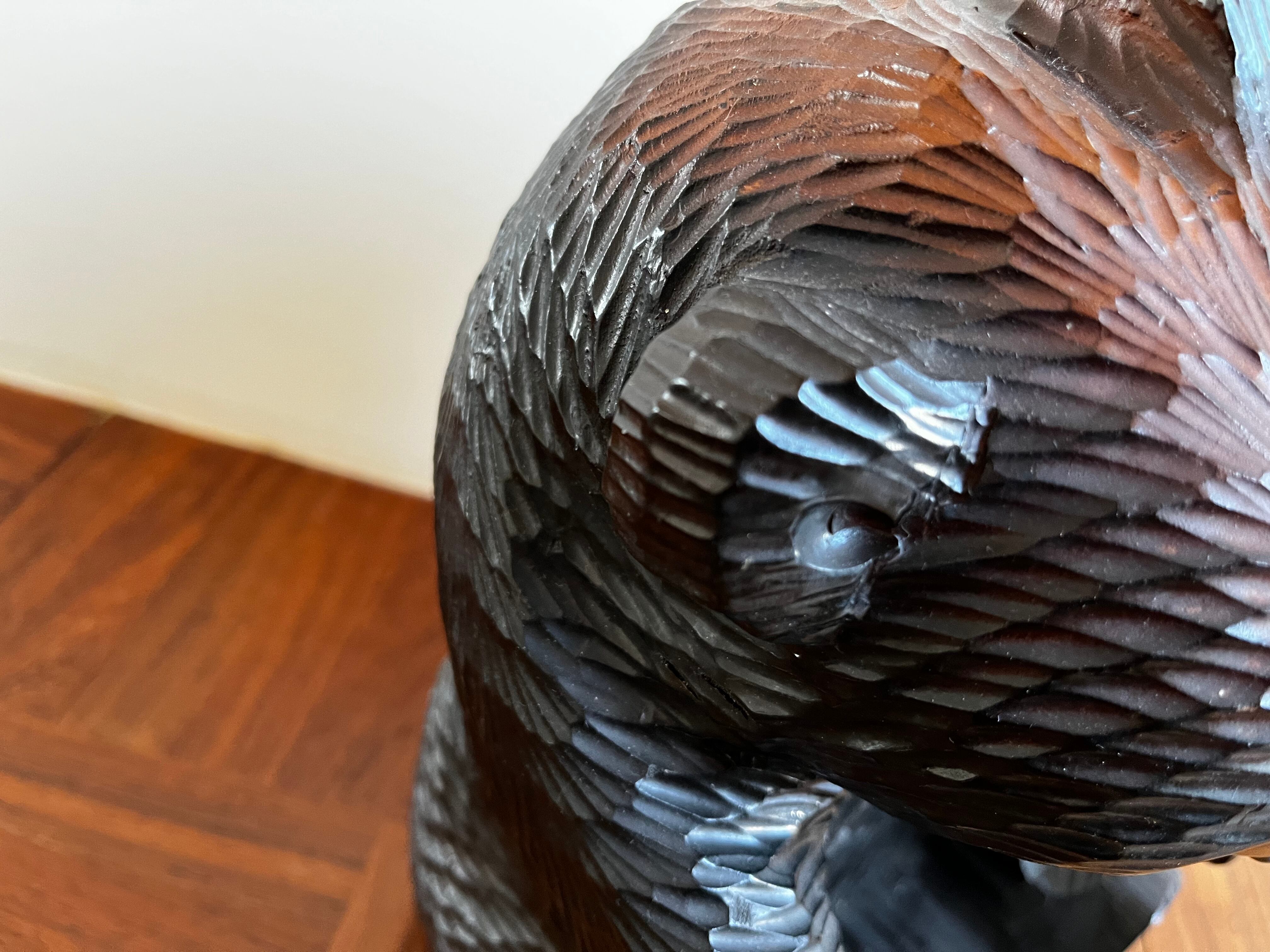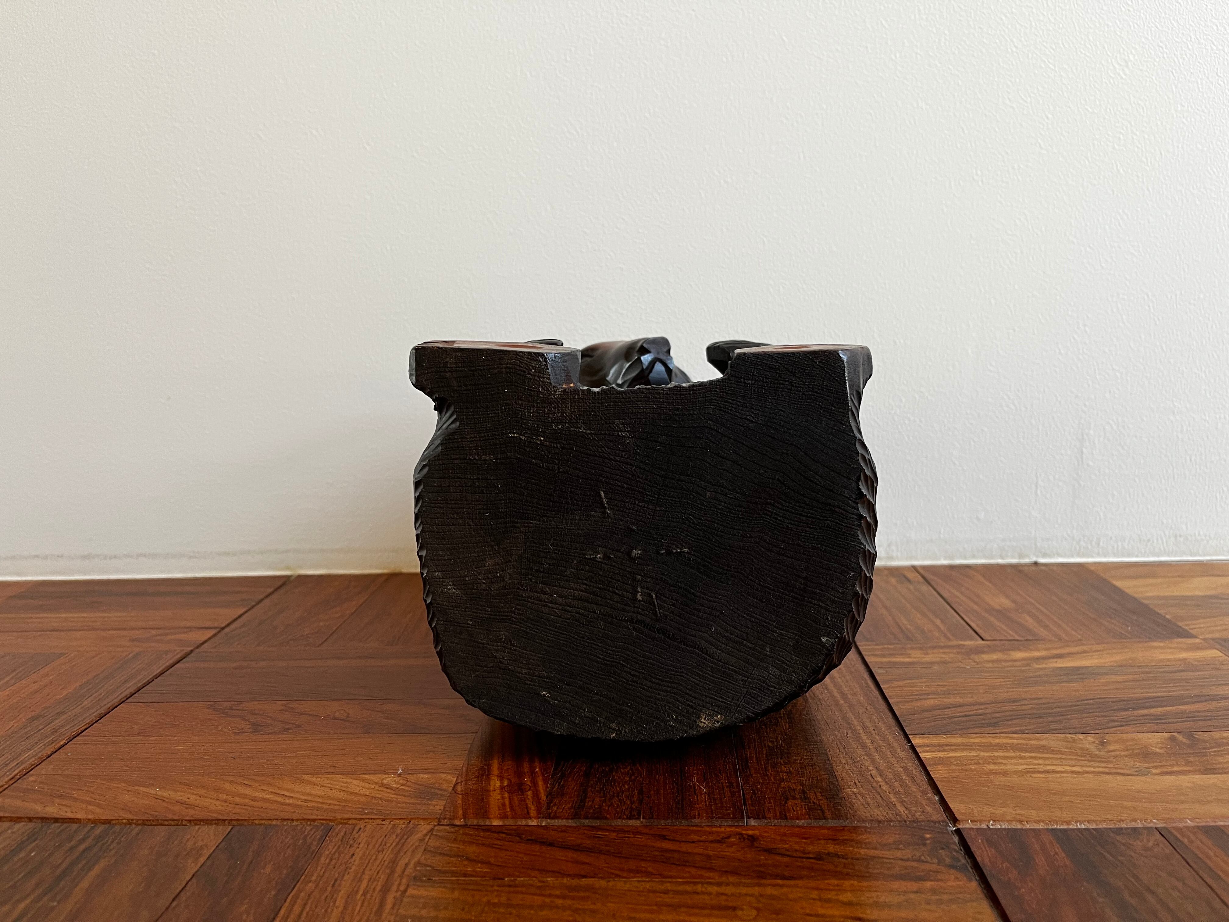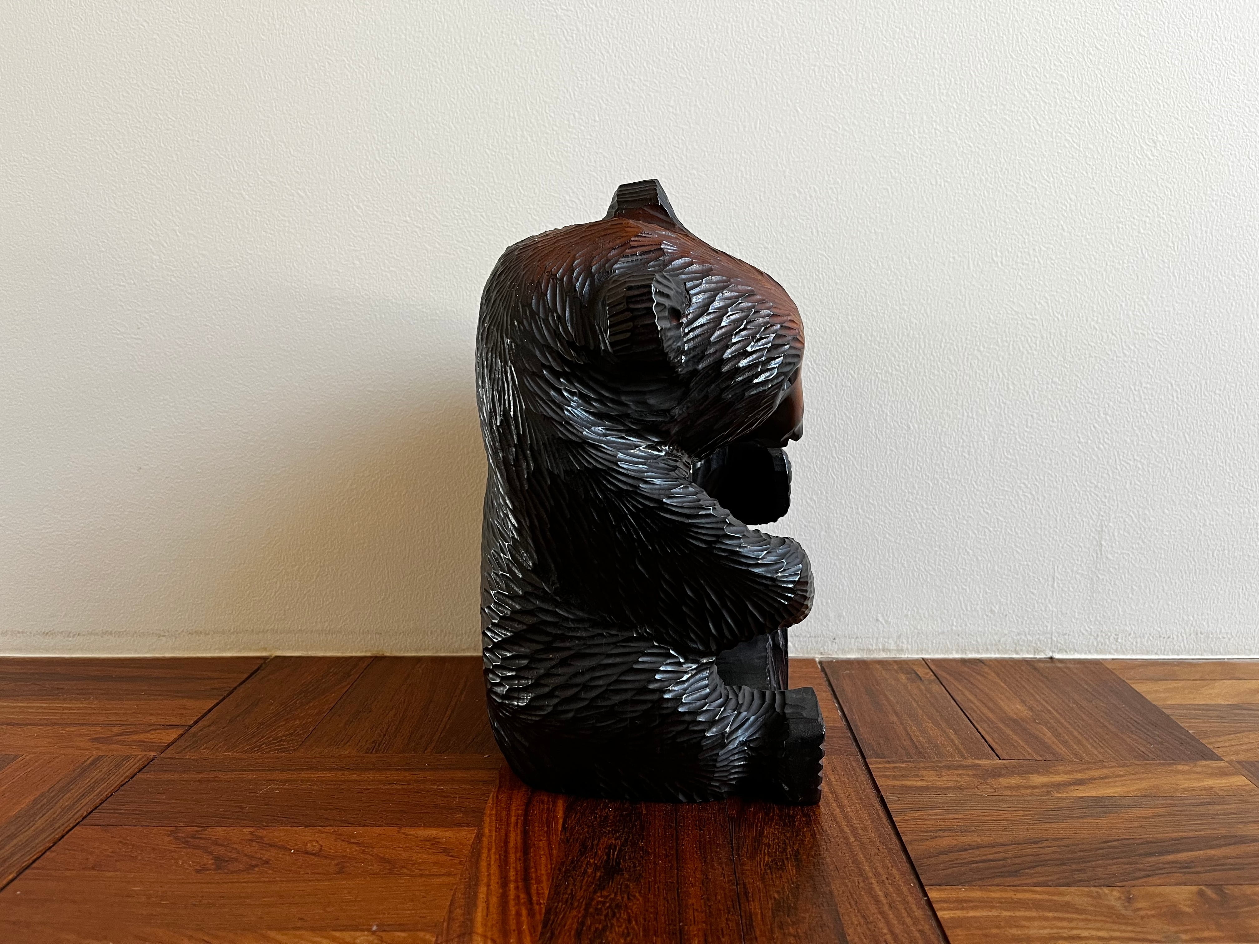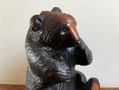 何かを抱えているようなしぐさを見せている木彫りの熊。