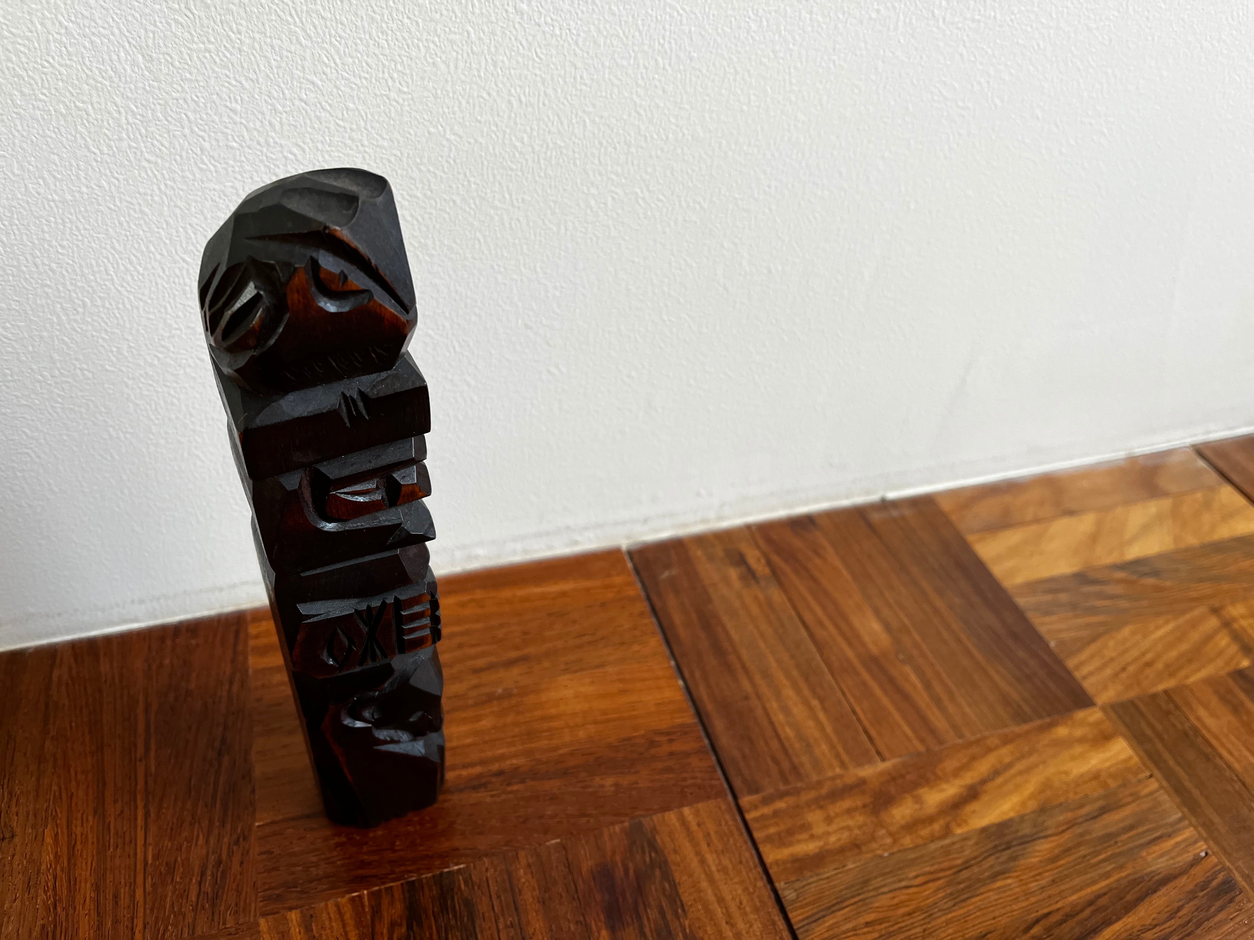 頭にふくろう、足元に熊を携えた、木製トーテムポール。