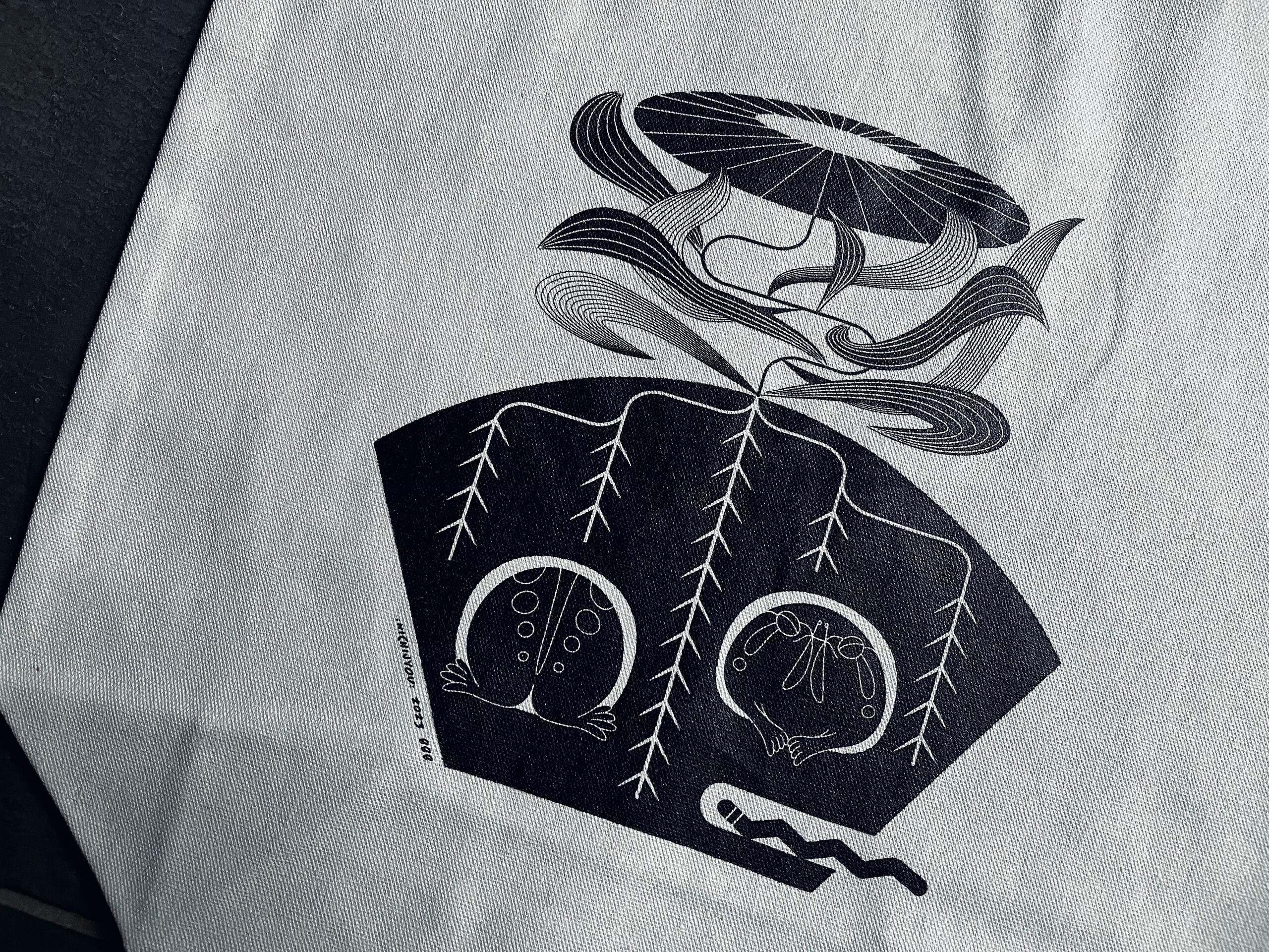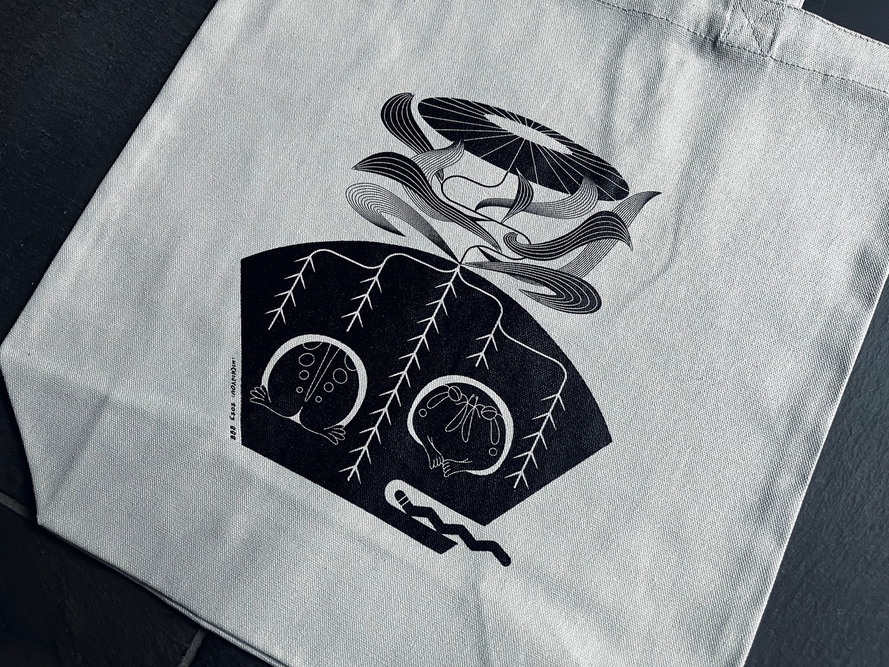 こちらはメーカーから取り寄せたトートバッグに国内工場で印刷を施した当店オリジナルの商品です。1枚ずつ手作業で印刷を行っておりますため、印刷位置のゆらぎやインクのノリ具合など、1つひとつの個体差を味わいとしてお楽しみいただけたら何よりです。