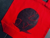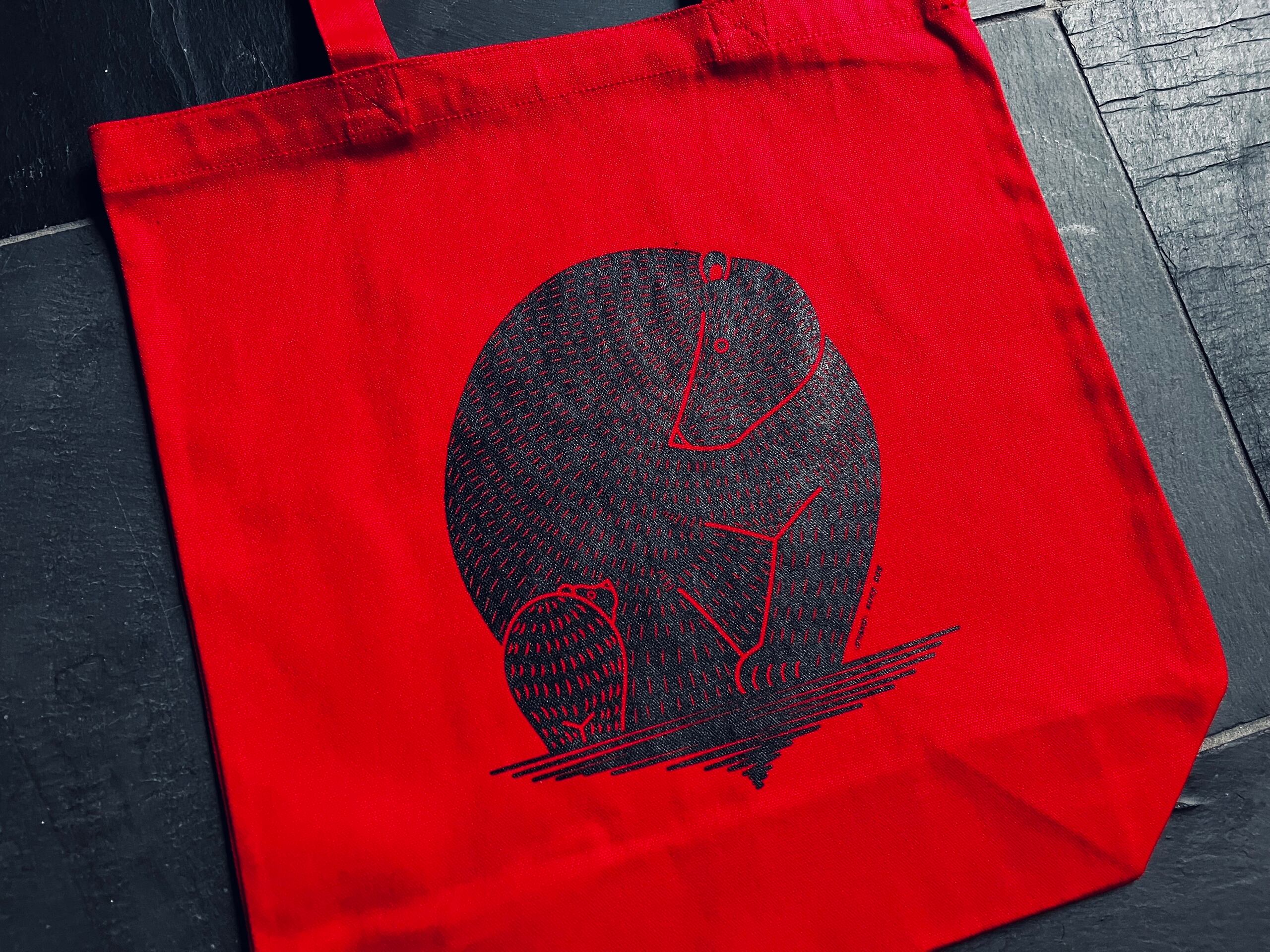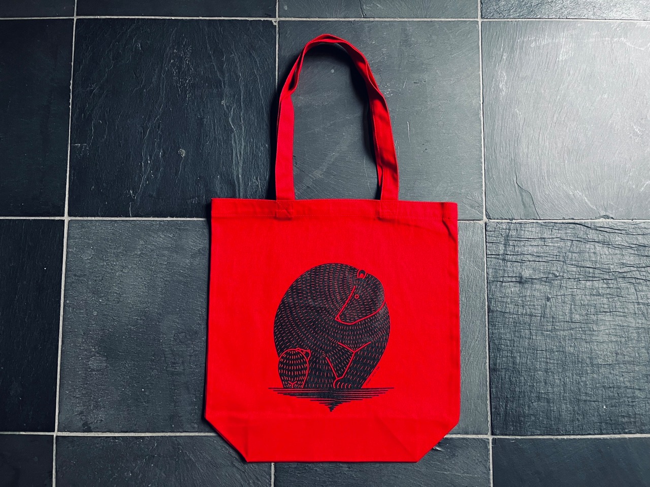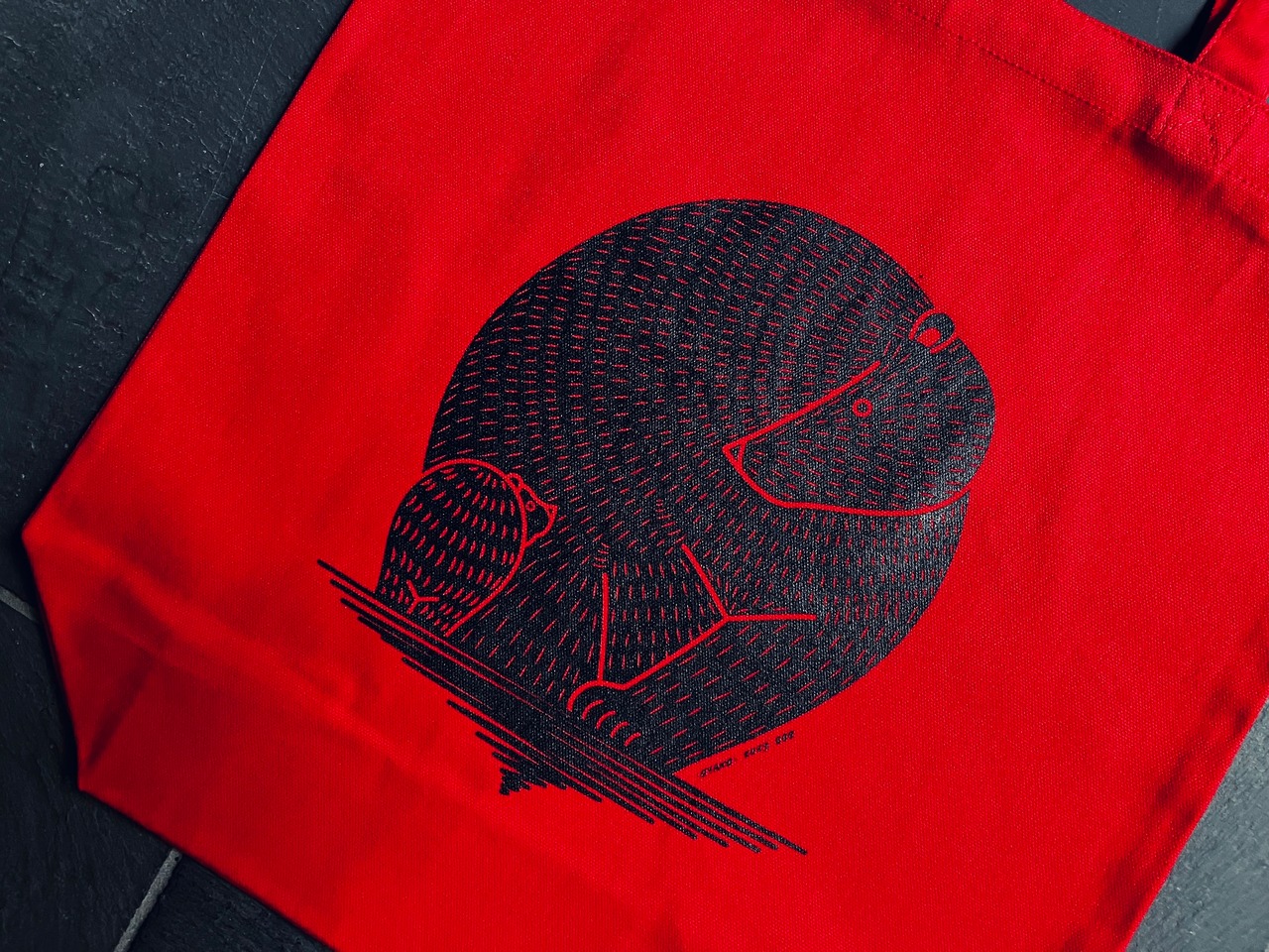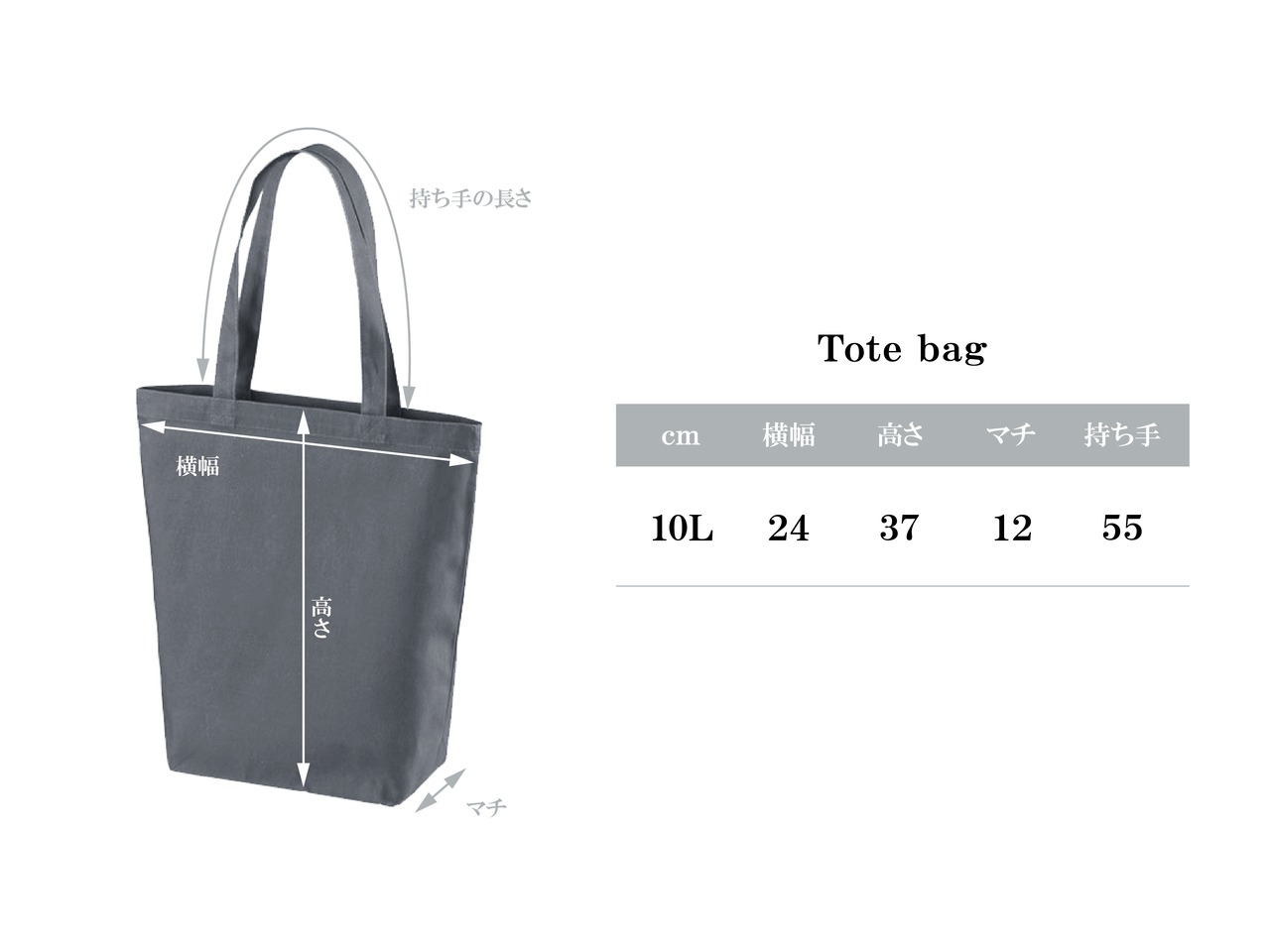 こちらはメーカーから取り寄せたトートバッグに国内工場で印刷を施した当店オリジナルの商品です。1枚ずつ手作業で印刷を行っておりますため、印刷位置のゆらぎやインクのノリ具合など、1つひとつの個体差を味わいとしてお楽しみいただけたら何よりです。
