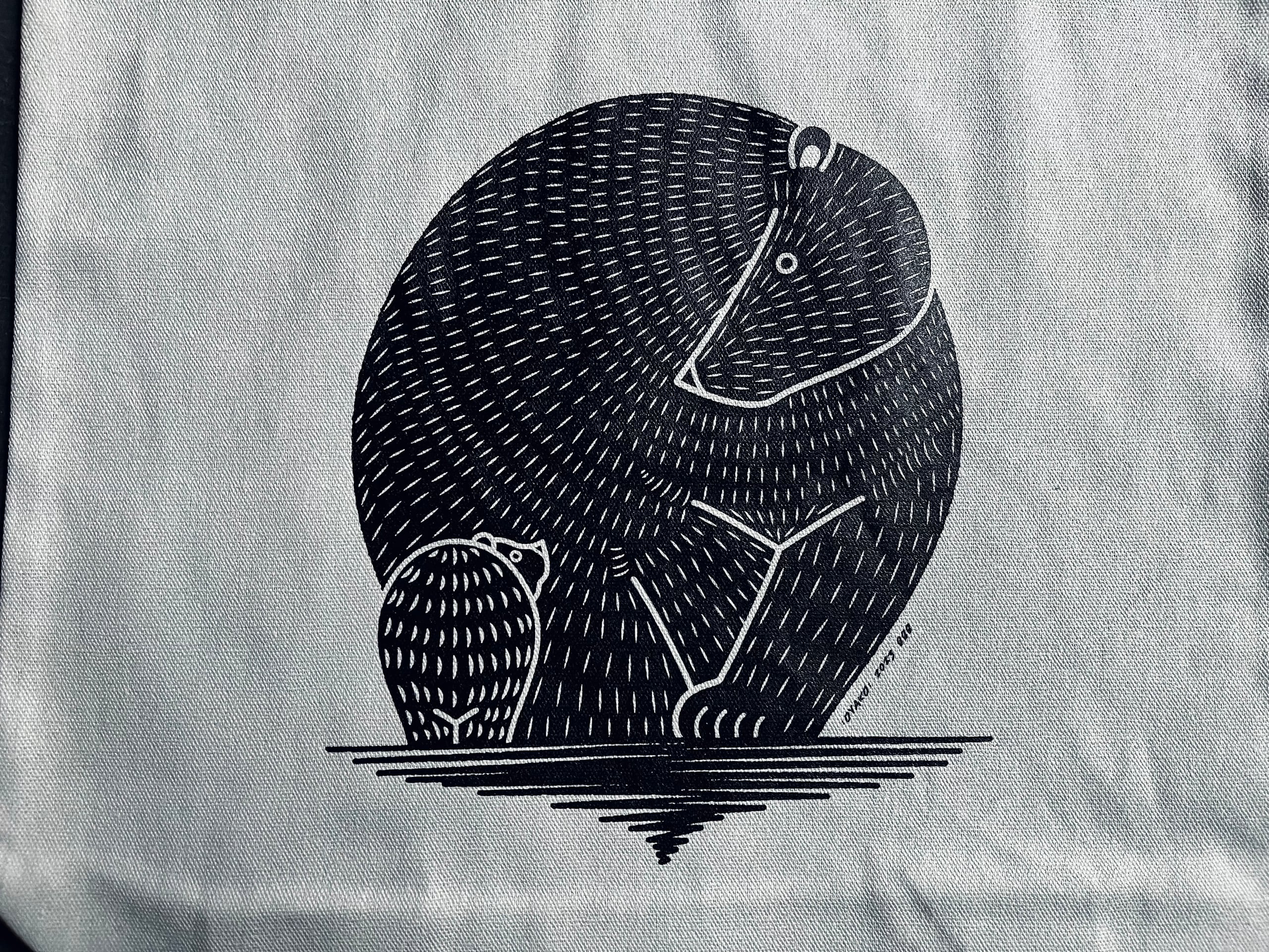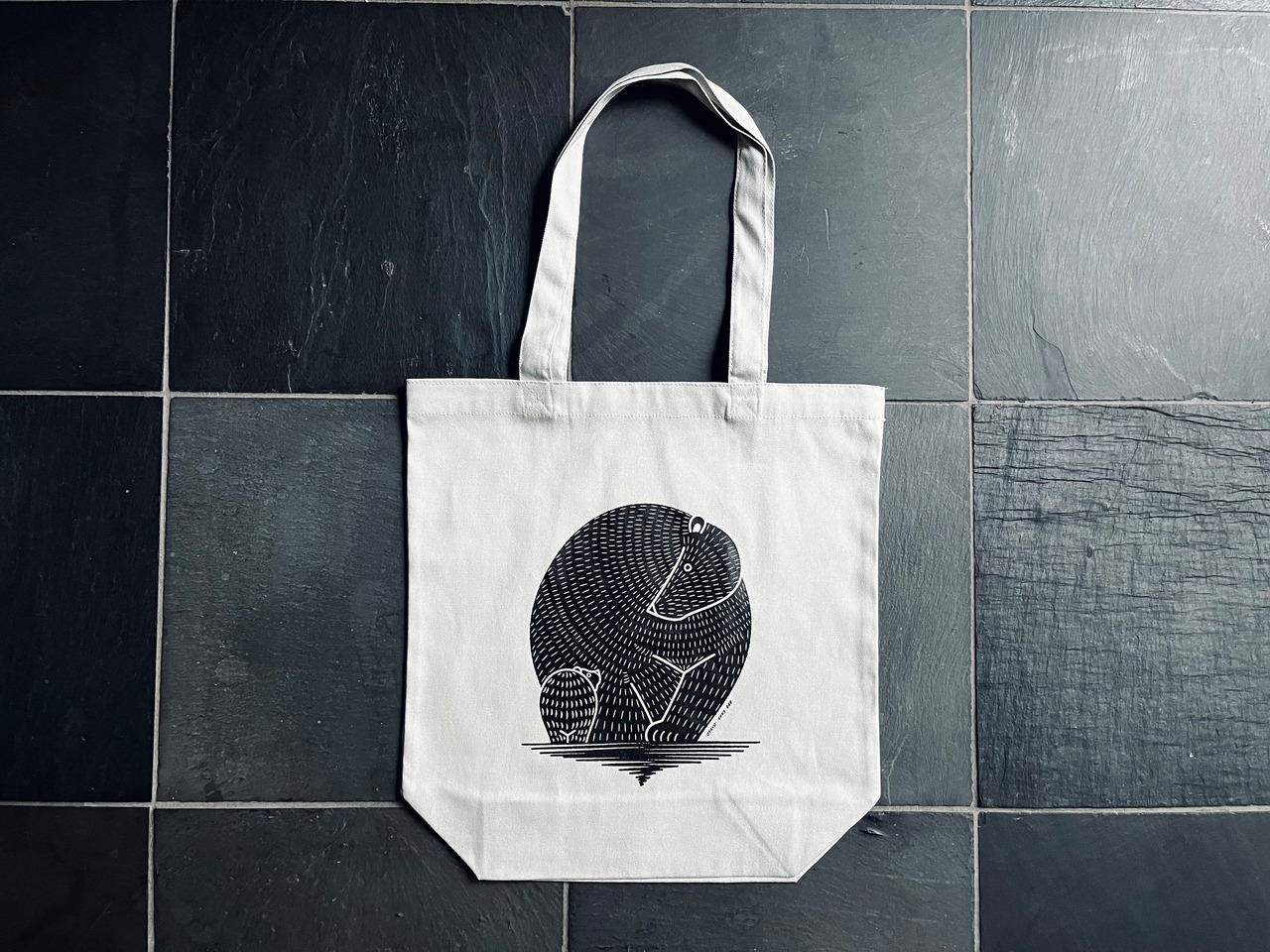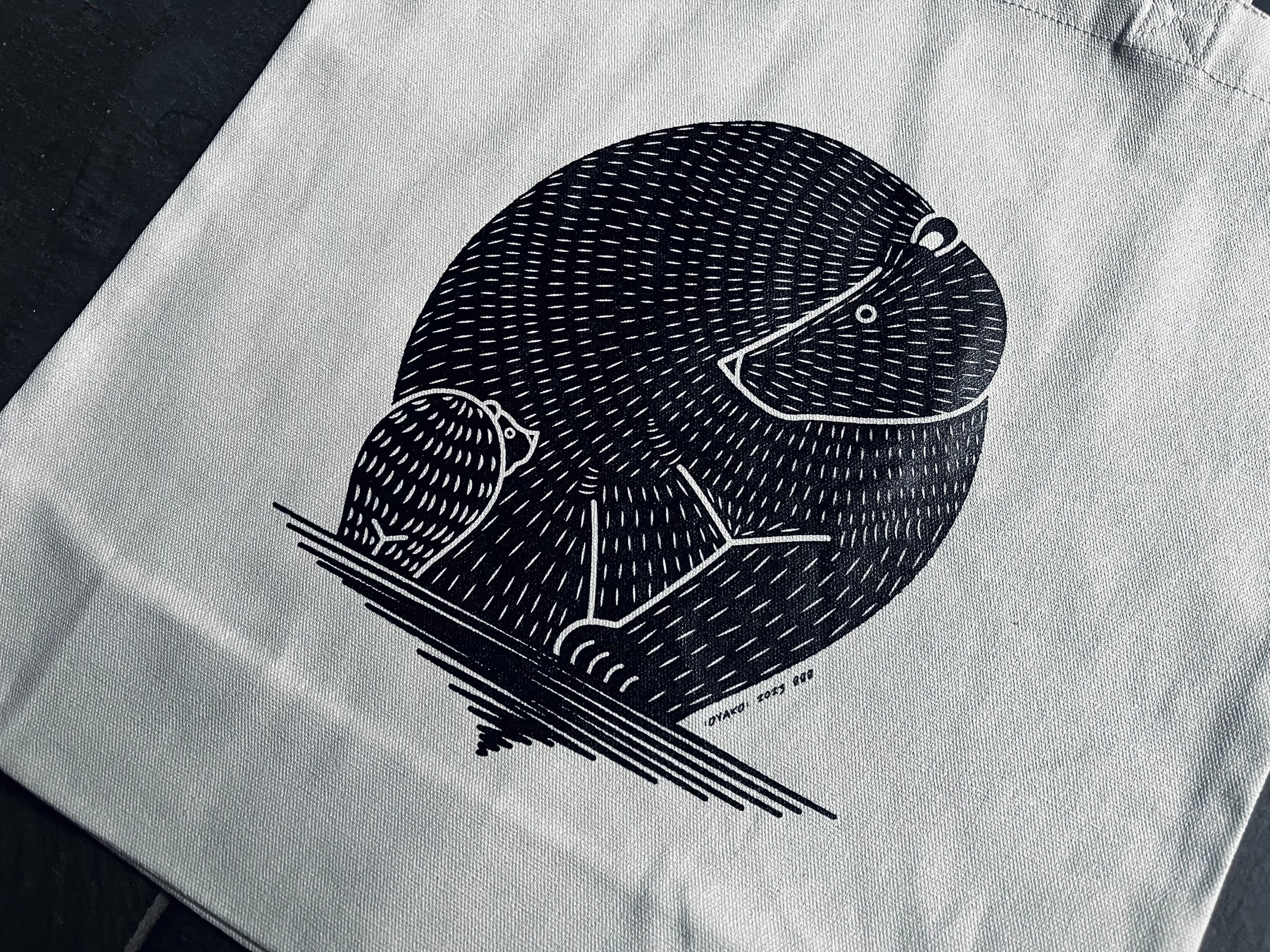 こちらはメーカーから取り寄せたトートバッグに国内工場で印刷を施した当店オリジナルの商品です。1枚ずつ手作業で印刷を行っておりますため、印刷位置のゆらぎやインクのノリ具合など、1つひとつの個体差を味わいとしてお楽しみいただけたら何よりです。