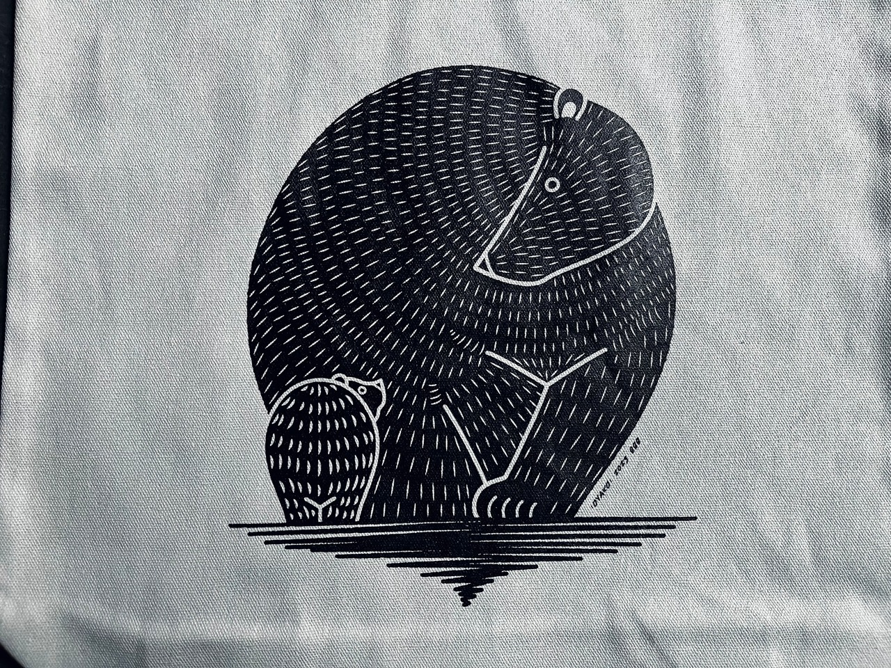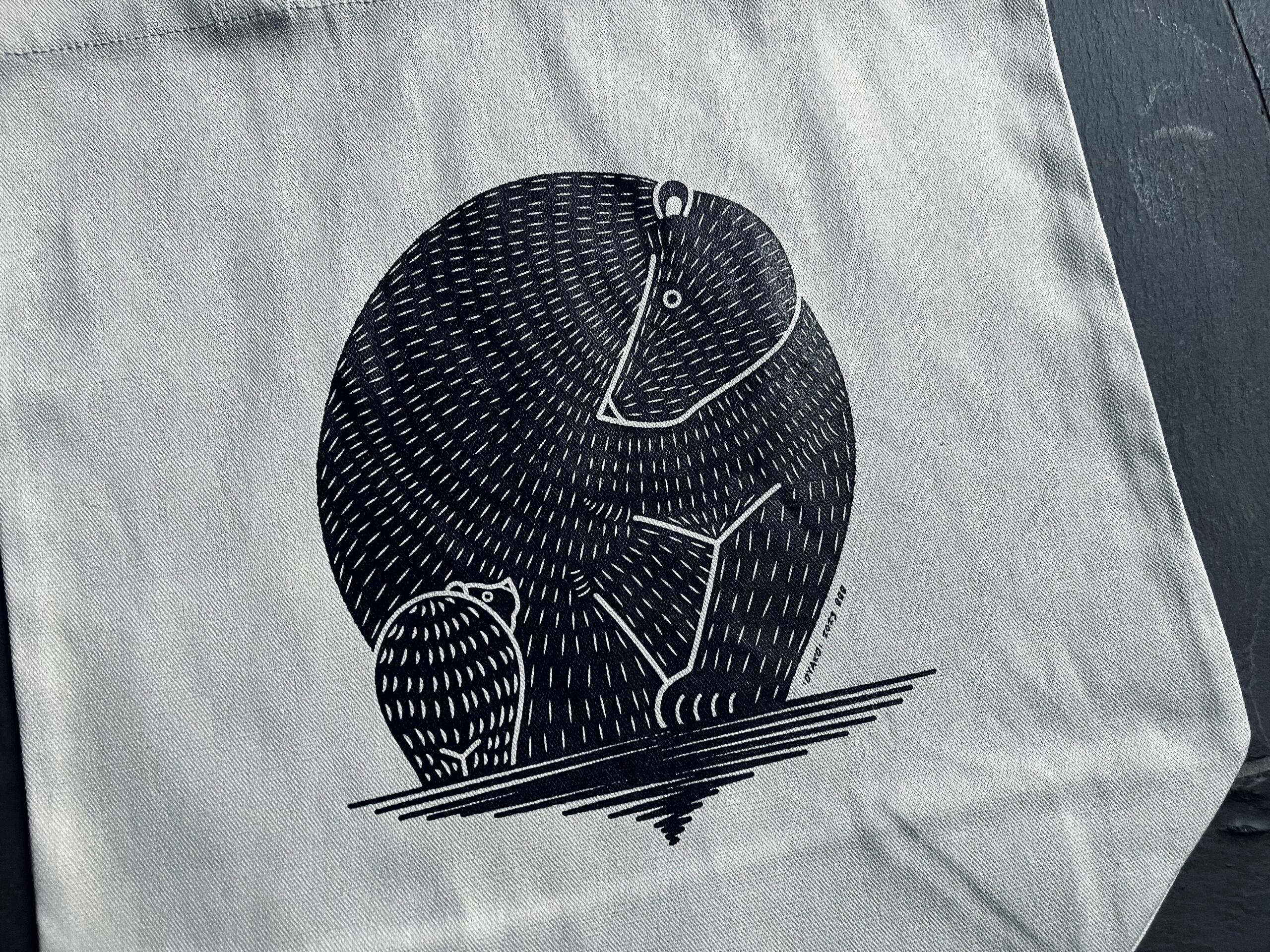 最近では食糧不足から人里まで降りてくるクマも多く、多数の被害も出ています。彼らも生きていくために必死なんだと思うと何とも言えない気持ちにもなりますが、こうやってお互いを愛おしく見つめ合う穏やかな姿も見てみたいなぁ…と想いながら描いたバッグです。